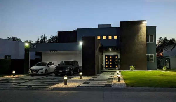 Questa moderna casa in stile minimalista è stata costruita nell'esclusiva zona residenziale del Country Club Gran Jardin a Guanajuato, in Messico. Questi apparecchi solari dal design moderno si fondono perfettamente con lo stile architettonico della villa.